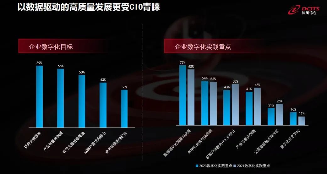 戴可提到,在红杉中国的一份调研报告显示,提升运营效率、产品服务创新以及整个企业战略的落地、数字化具体执行,还有像看到以客户体验超过了对业务规模拓展这样的诉求。此外,约73%的企业将“数据驱动的洞察与决策”作为企业数字化实践重点来对待,可见,以数据驱动的高质量发展更受CIO青睐。