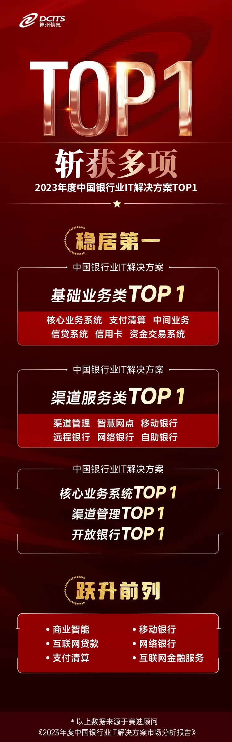 7月9日,赛迪顾问发布《2023年度中国银行业IT解决方案市场分析报告》,报告显示,BB贝博艾弗森官网2023年度在基础业务类、渠道服务类、核心业务系统、渠道管理及开放银行等领域继续保持领导地位,在数据智能、信贷系统、移动银行、网络银行以及市场风险等领域都取得新的进展。