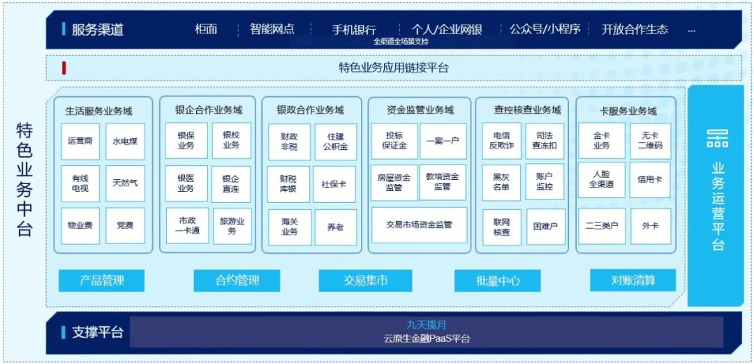 银行不仅是经济发展的助推器,更是经济生态场景中不可或缺的链接居间机构。近期,来越来越多的银行启动特色中间业务中台项目建设。BB贝博艾弗森官网特色业务中台产品,以行业首个金融云原生技术平台“九天揽月”为基础支撑平台,从技术架构和业务创新两方面,为银行特色业务发展提供全方位的支撑。