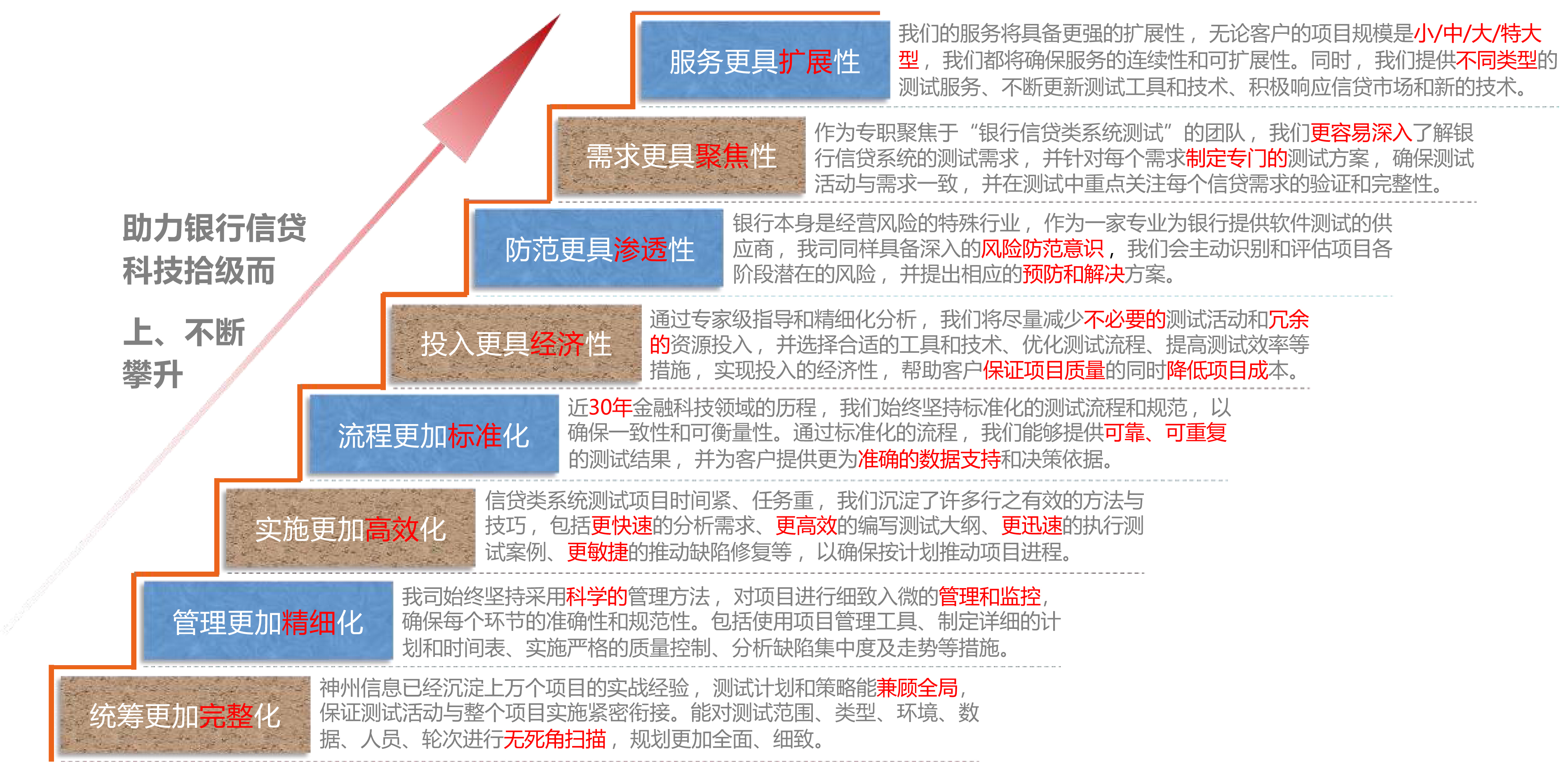 完善的测试管理体系,及优质、全面的测试服务,以高标准监控项目实施各个阶段,确保信贷类系统测试项目得以高质量的完成。